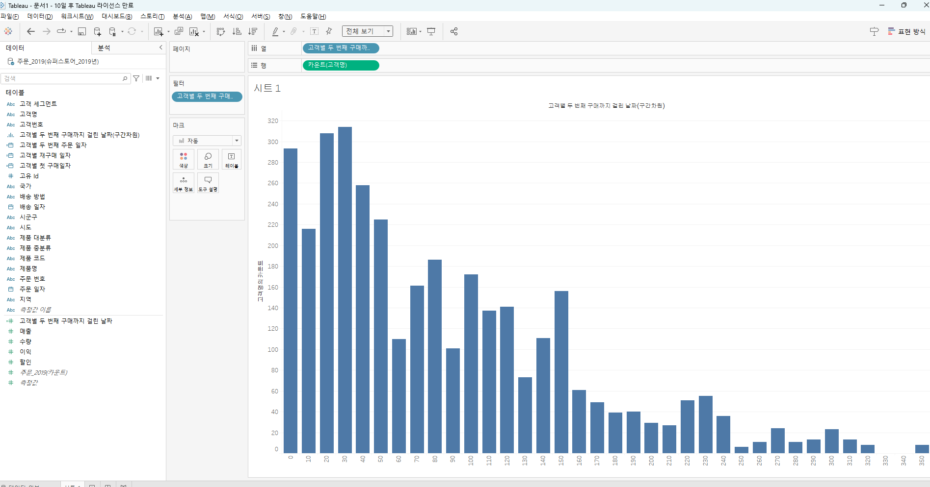 예를 들어, 첫 번째 막대는 첫 구매 후 10일 이내에 두 번째 구매를 한 고객의 수를 나타내고, 두 번째 막대는 10-20일 이내에 두 번째 구매를 한 고객의 수를 나타냅니다.